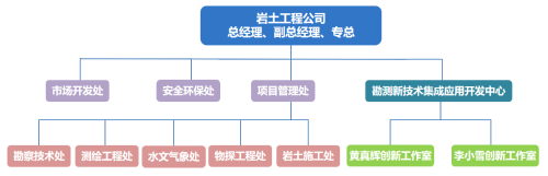 岩土工程公司下设9个专业室(处), 分别为:市场开发处、项目管理处、安全环保处、勘察技术处、测绘工程处、水文气象处、物探工程处、岩土施工处、勘测新技术集成应用开发中心九个处室,以及黄真辉、李小雪两个创新工作室 。